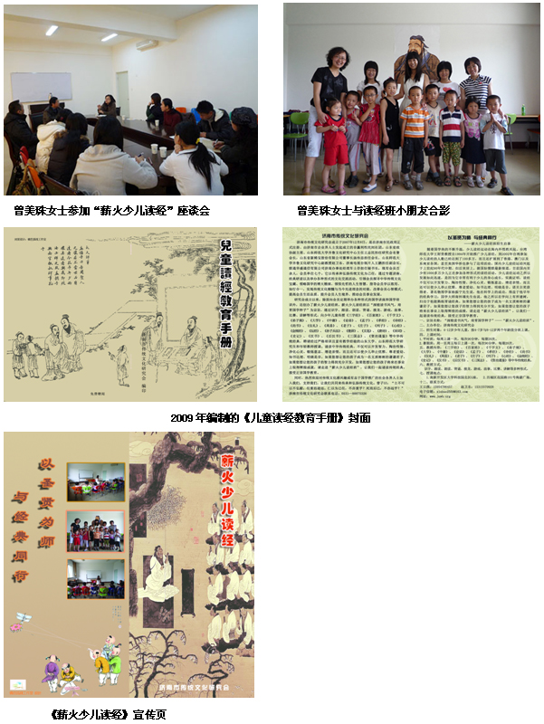 1、與山東師范大學齊魯文化研究中心合作舉辦薪火少兒讀經班4期,并于08年12月7日特別邀請北京大學哲學系博士研究生曾美珠女士與讀經班教師和家長在齊魯文化研究中心,就讀經的方法以及讀經過程中經常遇到的問題等進行了座談與交流;同時雙方合作出版《齊魯文化》雜志共3期。