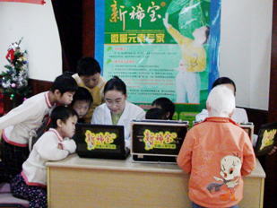 我企業(yè)董事長湯傳忠先生與福利院兒童的合影 我企業(yè)員工正在為福利院兒童進行微量元素檢測