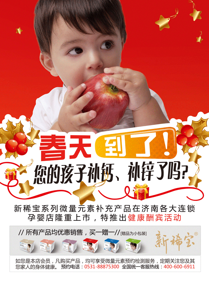 新稀寶系列微量元素補充產品在濟南疙瘩連鎖孕嬰店隆重上市,特推出健康酬賓活動。新稀寶牌鋅硒寶片兒童裝/孕婦裝,體恒健牌鈣之緣片兒童裝/孕婦裝,體恒健牌鐵之緣片兒童裝/孕婦裝優惠活動買一贈一,凡購買產品者均可享受微量元素預約免費檢測服務。新稀寶全國客服統一熱線:400-600-6911。