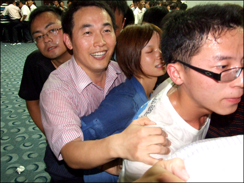 在講到“泛愛眾”這個章節時,任老師與大家分享了一個“同甘共苦”的互動游戲,他把現場人員分為12個組,每隊12至15人不等,大家并排站好,拼成一個緊湊的圓圈,每個隊員依次坐在后一位隊員的腿上,哪隊堅持的時間長哪隊就獲勝。開始時大家還感覺很輕松,隨著時間一分一秒的過去,疼痛感漸漸襲來,大家開始感覺體力不支,這時會議室的空調也停止運轉,七月的濟南,正是最熱的時候,不一會兒,大家就大汗淋漓。