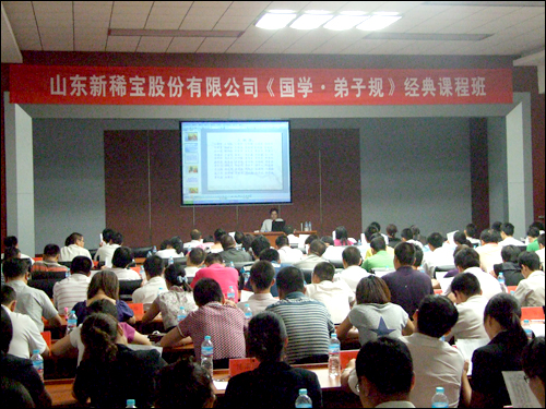 2010年7月14日,濟南高新區大學科技園四樓會議室里氣氛熱烈,掌聲雷動,這里是山東新稀寶外訓現場,來自全國的銷售精英和來自后勤的工作人員近200人參加了此次《國學.弟子規》經典課程培訓。
