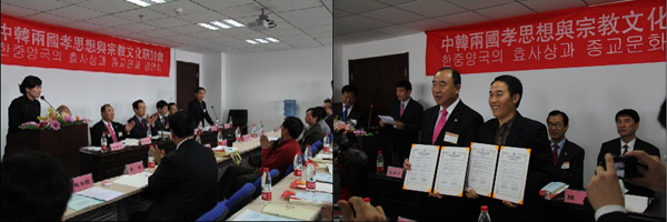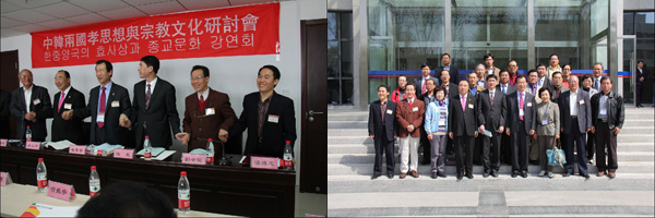 2011年4月13日,"中韓兩國(guó)孝思想與宗教文化學(xué)術(shù)研討會(huì)暨兩國(guó)學(xué)術(shù)機(jī)構(gòu)、團(tuán)體交流協(xié)議簽約儀式"在山東大學(xué)儒學(xué)高等研究院舉行。本次研討會(huì)由山東大學(xué)儒學(xué)高等研究院、韓國(guó)圣山孝道大學(xué)院、濟(jì)南市傳統(tǒng)文化研究會(huì)、韓國(guó)大田廣域市孝指導(dǎo)士協(xié)會(huì)等單位主辦,山東省老齡委孝文化專(zhuān)業(yè)委員會(huì)、韓國(guó)大田廣域市、韓國(guó)孝運(yùn)動(dòng)中央總會(huì)、韓國(guó)大田廣域市孝實(shí)踐運(yùn)動(dòng)本部聯(lián)合承辦。會(huì)議由山東大學(xué)儒學(xué)高等研究院副院長(zhǎng)顏炳罡教授主持,來(lái)自中、韓兩國(guó)的專(zhuān)家學(xué)者逾80人參加了此次研討會(huì)。