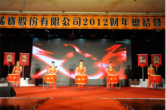 陽春四月,春染濟南,生機無限。2013年4月17日,“山東新稀寶股份有限公司2012財年總結暨表彰大會”在黃臺大酒店齊魯廳隆重開幕。來自醫藥事業部、電商事業部的全體精英以及后勤各職能部門、生產基地和孕嬰事業部的部分代表共計300余人參加了此次盛會。董事長湯傳忠先生、常務副總經理杜征國先生、副總經理鄭朝霞女士及其他高層領導共同見證了這一盛舉。會場內充滿了濃濃“旌旗獵獵會英雄,戰鼓隆隆震天地”的戰場古風,自信熱情的笑臉洋溢著新稀寶人火熱的激情,飄揚的戰旗、雷動的鼓聲展現了新稀寶人誰與爭鋒、舍我其誰的霸氣與豪情。