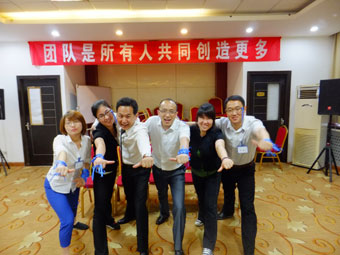 隨后,在大家熱切的期盼中迎來了第一個團隊游戲。這是一個看似非常簡單的游戲,開始之前每一位隊員都充滿了必勝的信念,大家相約要以最短的時間完成任務。在游戲進行中,大家才突然意識到,看似小小的道具并不像他們想象得那么容易駕馭,本意是向下,它卻偏偏朝上,一個預計在20-30秒就可以完成的游戲,每隊卻花費了近20分鐘的時間,大大出乎意料之外。這時候大家才明白:“放下”原來是這么難。其實很多時候我們心里想的是我們要拿起什么,卻很少思考我們需要放下什么?放下榮耀、放下經驗、放下負擔、放下一切阻止我們前進的障礙,只有先放下才會有機會拾起。