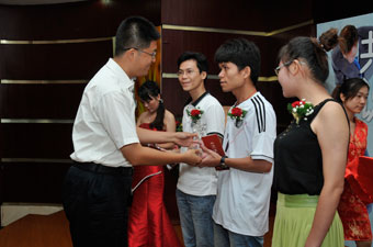 董事長湯傳忠先生為新任的管理人員頒發任命書                             發展部經理馮小龍先生為獲獎人員頒獎