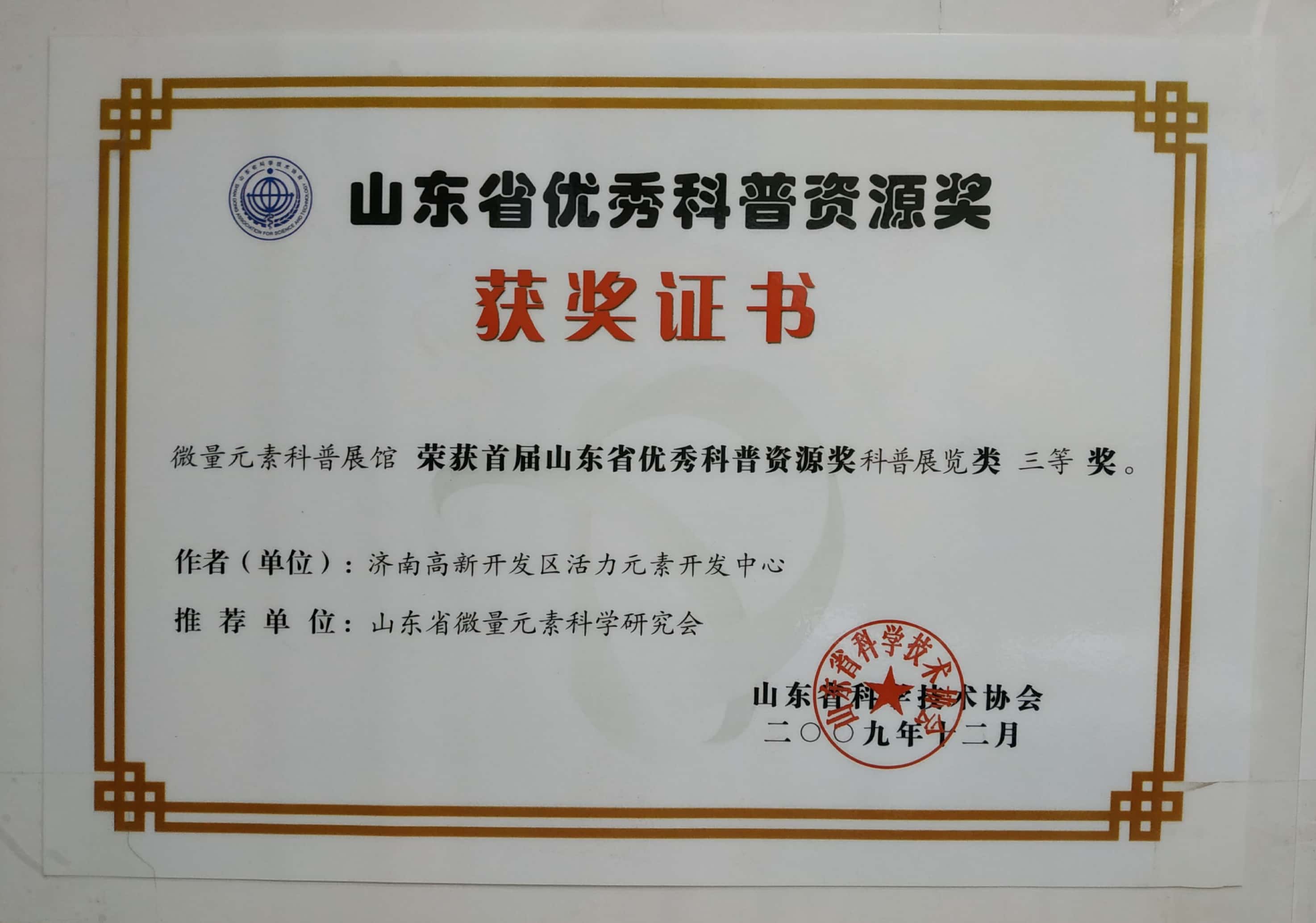 2009年被山東省科學技術協會評為“山東省優秀科普資源獎”