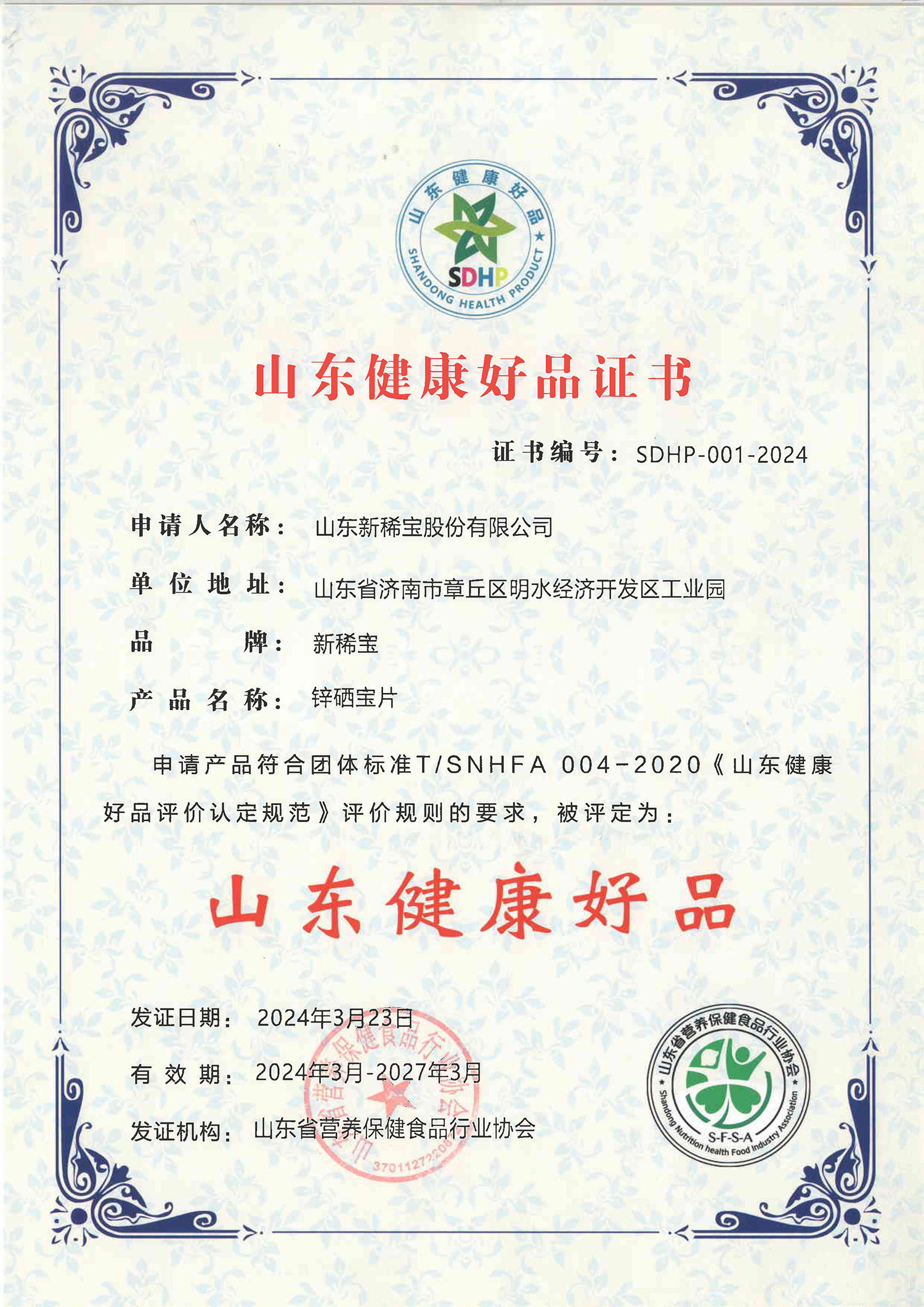2024年3月23日,山東省營養健康產業高質量發展論壇在青島順利舉辦,會上公布了第二批山東健康好品獲獎名單。其中,新稀寶集團旗下產品“鋅硒寶片”被二次授予“山東健康好品”的稱號。